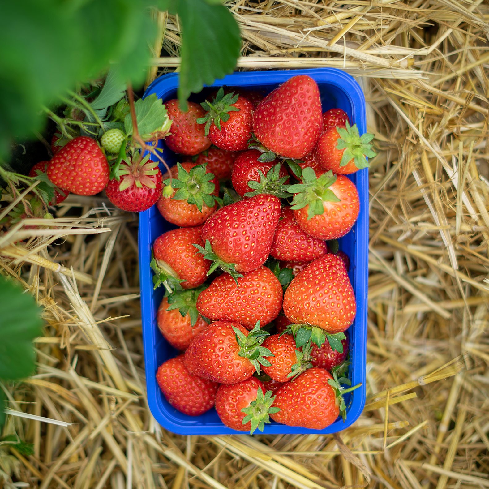 Leuchtendrot und duftend aromatisch, so präsentieren sich die ganze Saison über unsere beliebten Erdbeeren. Auf unseren Feldern können Sie die Erdbeeren selber pflücken und an unseren Verkaufsständen erhalten Sie zusätzlich zu den frisch geernteten Erdbeeren noch zarte Frühkartoffeln aus der Region, liebevoll selbst hergestellten Erdbeeraufstrich, Erdbeersirup und Erdbeeressig, sowie Tortenböden und Torteletts aus regionalen Bäckereien.